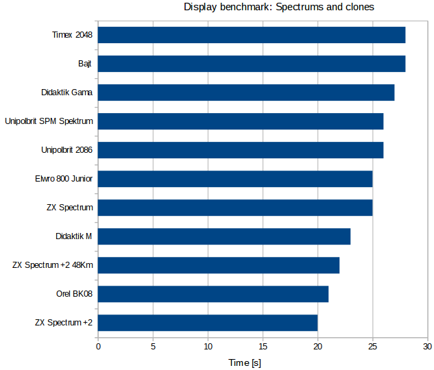 2. Display test - Putting 400 lines: 200 of 16 characters interlaced it by lines with number of current iteration. This way VRAM speed is benchmarked