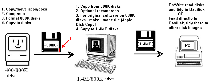 The most important thing: If you have an old Mac with 400/800K drive, and you have 400/800K disks, DON'T STICK IT INTO PC OR NEW (MacOS X) MAC! Disks may be immediately destroyed even if the write protection hole is set! The procedure for 400/800K disks is described much lower.