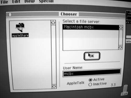 Go to client computer, Apple Menu->Chooser. Select AppleShare, enter User Name - the same as in the Server, select this Server, click OK. You will be asked for password and there will be a window with auto-mounting (selecting volmues with "X" in box) - DON'T SELECT IT. If you select it, it'll try to automount the drive every boot making it painfully long if no cable will be connected.