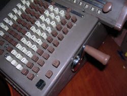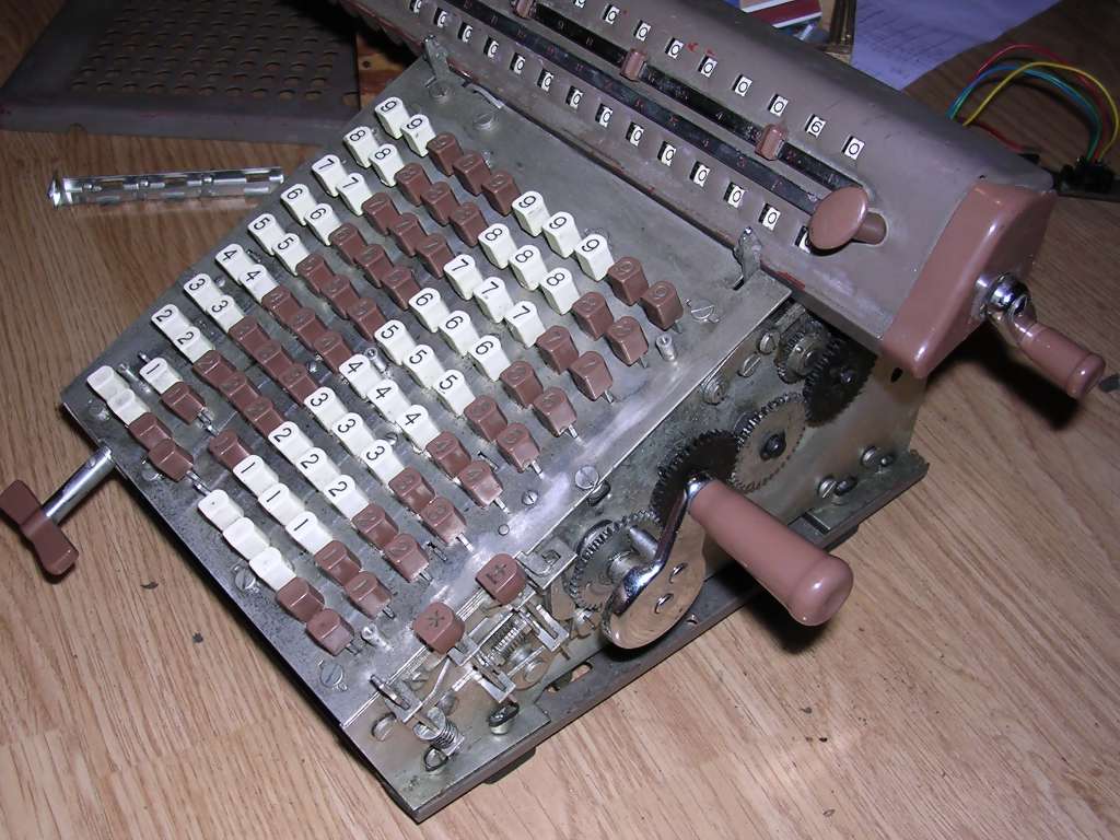 The mechanical principle of operation is simple: When you press a key, a lever is pressed in its specific place. This place has a protrusion bent in angle specific to digit. So, when you press a key, the lever moves a distance specific to the value, there are about 5 distances per lever, for one digit one lever moves to the left, another one moves to the right, so there are 9 levers positions like 9 digits per one 0-9 "key set". These levers shift specific gears, which have teeth of different length in their cylindrical length, as a result, forming a gear with specific number of teeth. By turning crank, these gears transmit their value into upper counters.