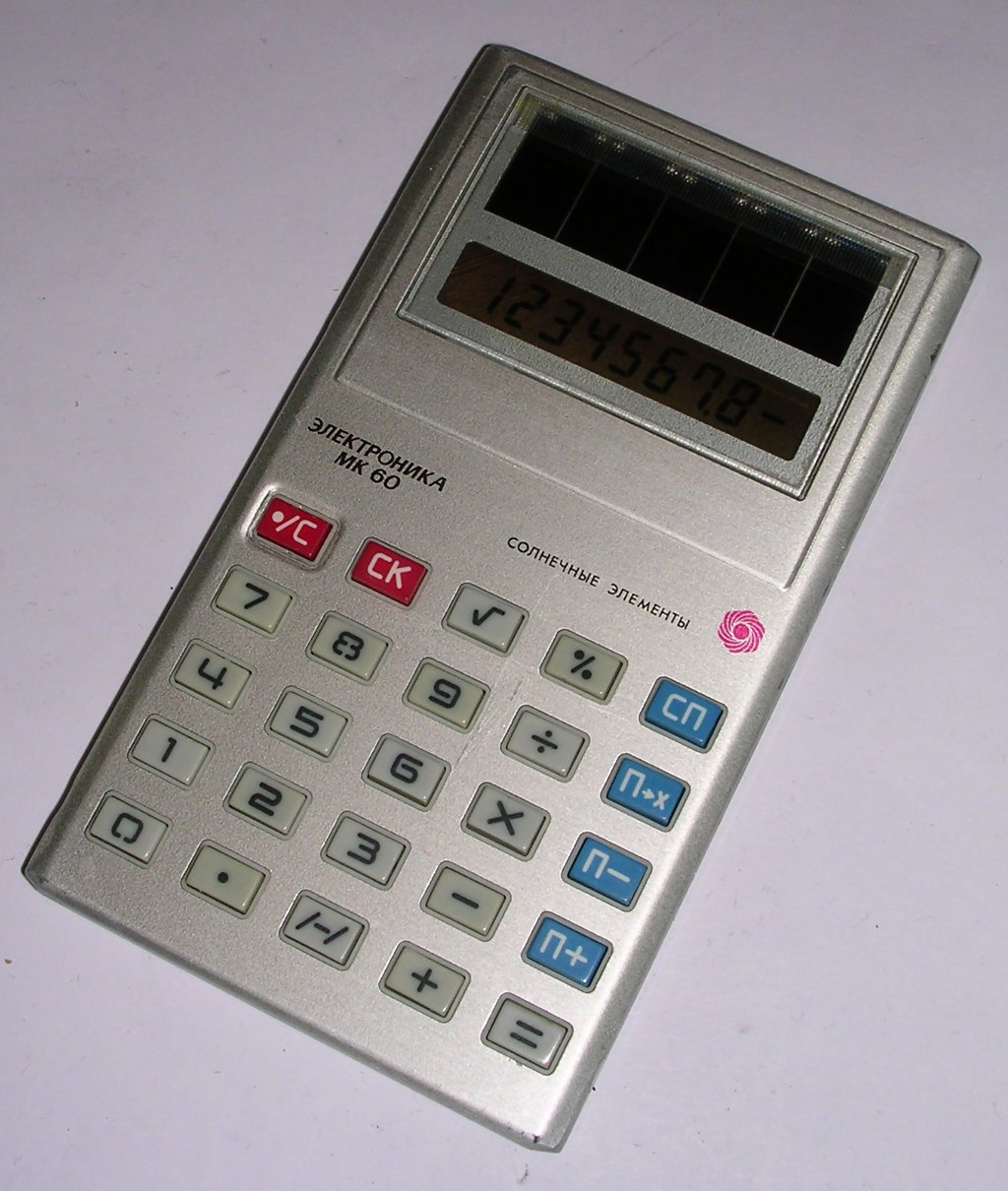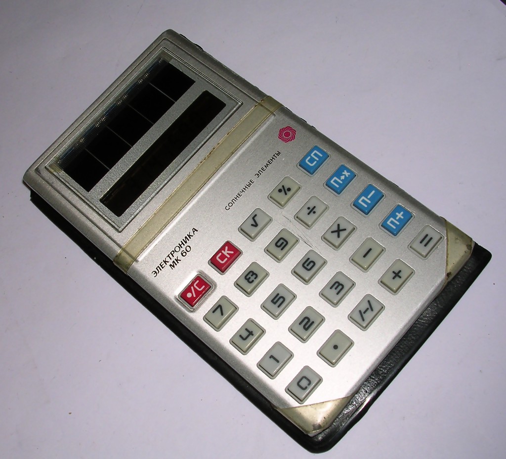 The first Soviet calculator powered by solar cells and the first solar-powered calculator in Eastern block, manufactured since 1982 till early 1990s (?1994?). It was promised that it'll work when exposed to 100W incandescent bulb light in maximum distance of 2m or 60cm away from 15W fluorescent lamp. Small, portable, simple, made with Soviet components.