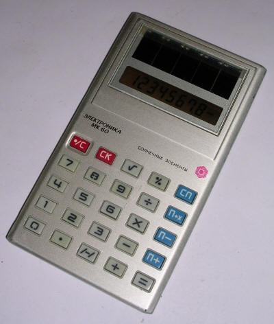 They had calculators too. They were rare as manufacturing was expensive, but some of them were exported to other eastern block countries. Usually Soviet calculators used soviet chips which were sometimes (but not always) clones of western circuits, for example Elka printing calculator used original Rockwell's chip and later Soviet copy. Parts like display tubes, diodes, capacitors, sometimes LCDs and solar cells could be manufactured in soviet factories. Solar cells based calculators used very small backup capacitors because larger capacities were expensive.