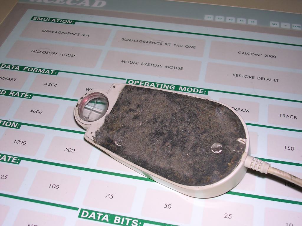| Information: Tablet used with IBM PC to make interactions in CAD easier, allows to select objects and move them precisely. Two pointing devices can be connected. One is a 4-button mouse calibrated with RF, not ball, second one is probably a stylus. It can emulate a standard mouse or typical graphics tablets of early 1990s. Power supply: |