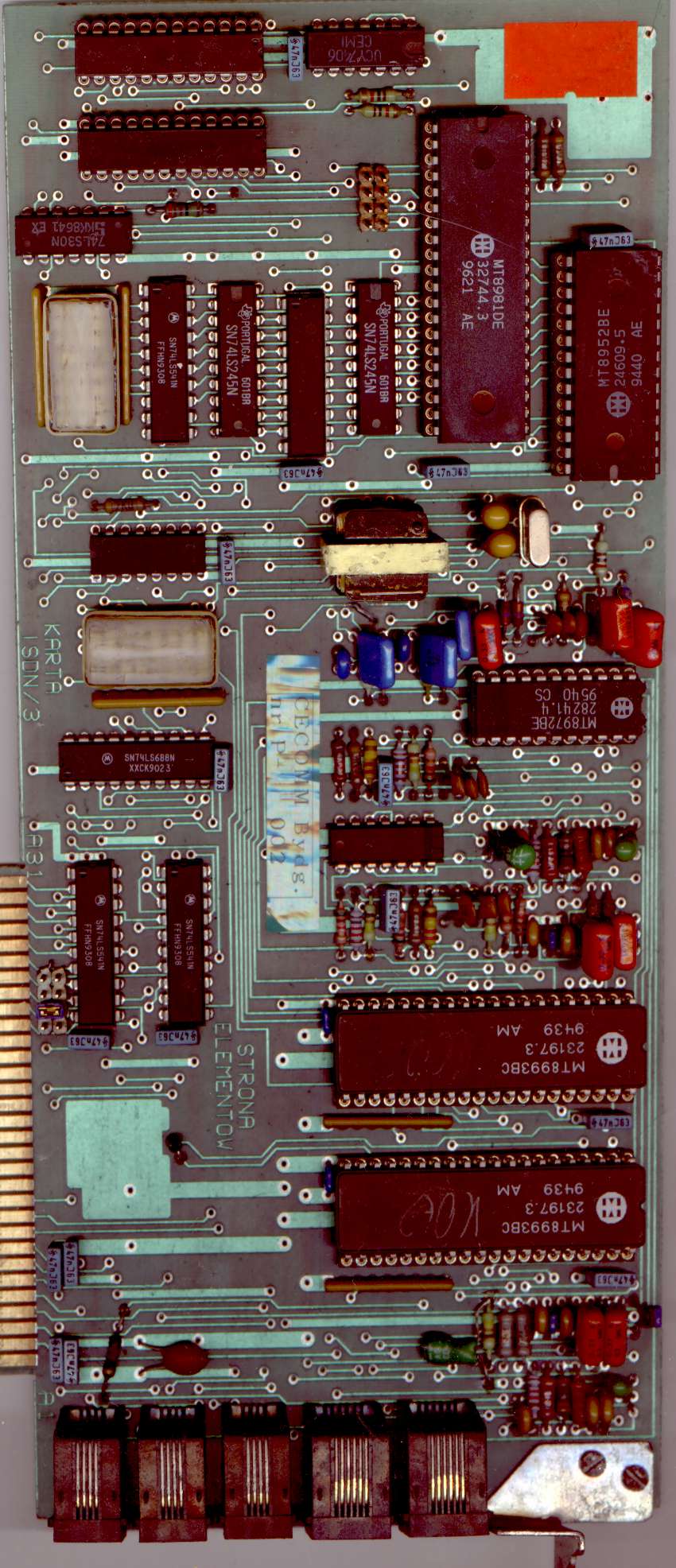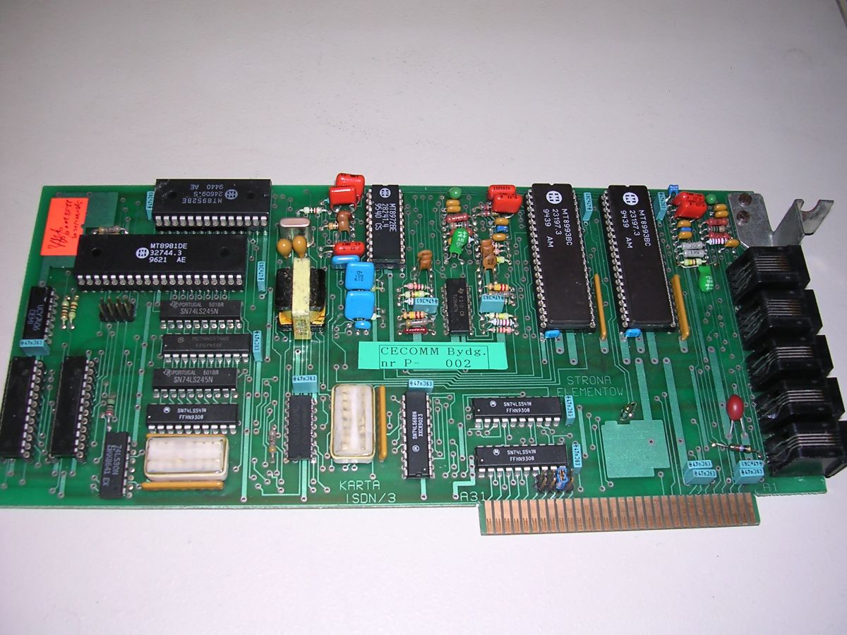 This card is 1n 8-bit ISA board made with technology from Mk. 2 cards. It consists of 2 digital telephone circuits and all needed circuitry to support few phone lines. The description written in PCB is "IDSN/3". The card has 3 4-pin RJ connectors and 2 8-pin ones, probably to connect the computer to internal network.