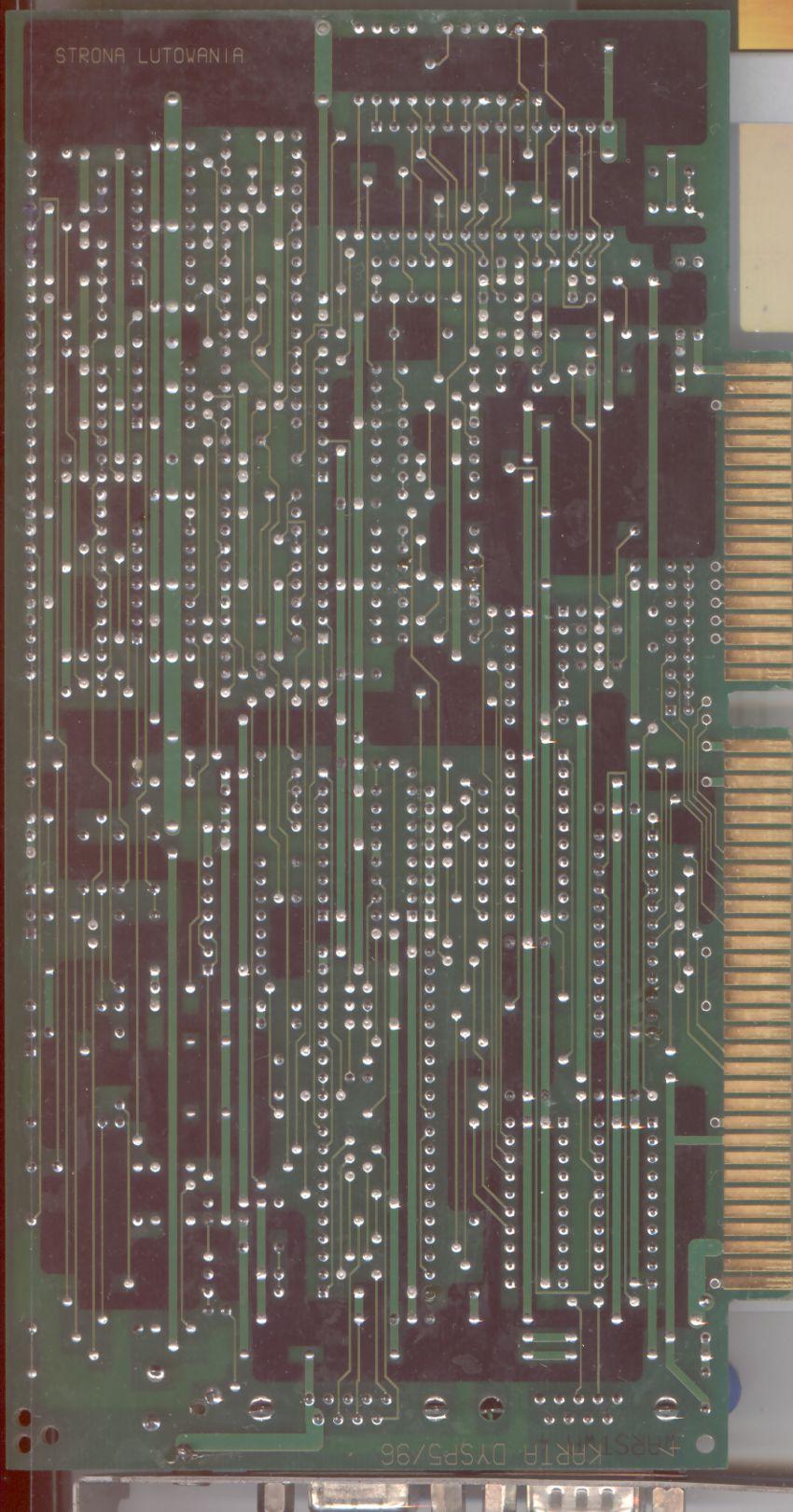 This card has description "DYSP5/96", and first units are from 1995. It is much better design than Mark 1. The circuit is similar, but now the line is switched by a relay so it is more immune to phone line surges. More components are western, so the card is smaller. Most of 74 logic has been replaced by a GAL circuit. And this card is 16-bit ISA, so it can work with other cards occupying 8-bit slot address space. It has some unknown jumpers (probably address selection) and DIP switches (probably selecting internal configuration). The board has 4 layers, with 2 power fill layers to shield fragile signals from interferences.