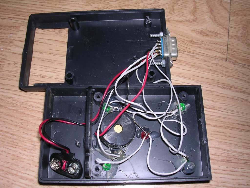 Simple joystick tester: It requires 9V 6F22 battery to run, and after connecting joystick it lights a LED for each direction and fire. Every time the joystick's contacts are shorted appropriate LED lights up and buzzer emits sound.