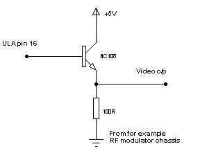 Modification shown in photos below uses BC547 transistor with base connected to resistor (which goes to ULA pin 16), taking 5V from the hole, which is connected with 5V supply of RF modulator. The ground is taken from alternative regulator connections near Jack sockets. RF modulator is modified by unsoldering RF resistor from socket and going outside with this wire (edge of can). Input line is connected to the socket through ready hole in RF, near signal input. Now a switch is installed to switch the socket between RF and Composite. To preserve the case it can be installed near expansion port using hot glue, which: a. doesn't need to cut the case and b. can be easily removed to restore original ZX81.