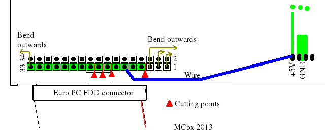 First, bend pins 33 and 34 slightly outwards. Do the same thing with 1,2,3,4,5 and 6 (don't connect them!). There may be no pin 3, it's normal. This makes space for Schneider's connector. Carefully cut track joining pin 5 (third counting right to left) with the rest of grounding pins. Now look haven't you cut ground to other parts of FDD. If so, use additional wire to fix this using grounding pins on the left side of the connector to take grounding from, but keep this pin separate from any ground signal.