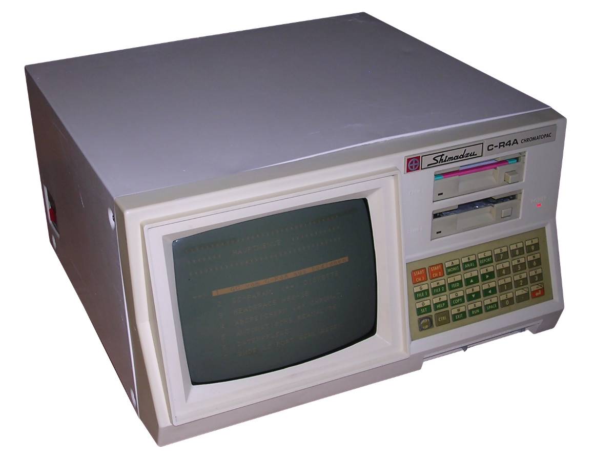 This is probably some control computer for gas chromatograph. It works as data collector, integrator, data processor and viewer. It is based on Intel 8088 processor and has 512kB of RAM. Such large amount is needed to buffer data incoming from chromatograph before writing it to the floppy disk.