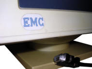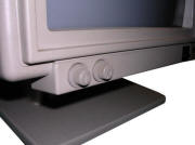 A generic Monochrome/Hercules monitor with small amber CRT. Underneath, it has a power switch and two sliders for brightness and contrast. Its power connector is a power supply unit plug for plugging into PC's power supply power output.