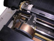 from it making it not go equally on length. About quality of this process - everything depends on ink used. Good ink will make the ribbon print like new, bad ink may even block pins. Fortunately this unit is newer so it has no light bulbs inside - speed setting is made with a thyristor. It is nearly the unit described in patent, yet holding cartridge in place is done by other felt cylinder keeping parts. The timer is only for alarm, it doesn't break circuit and is not connected to circuitry at all. It was built in 1996. |