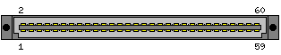 | 1 - ABUF 3 - REDY 5 - BCOM 7 - NMD1 9 - DTR 11 - PDET 13 - CCLK 15 - HLDA 17 - IACK 19 - IOM 21 - A18 23 - A16 25 - A14 27 - A12 29 - A10 31 - A8 33 - HLDI 35 - GND 37 - OA7 39 - OA5 41 - OA3 43 - OA1 45 - AD0 47 - AD2 49 - AD4 51 - AD6 53 - EINT 55 - VEXT 57 - BATD 59 - 5VS |