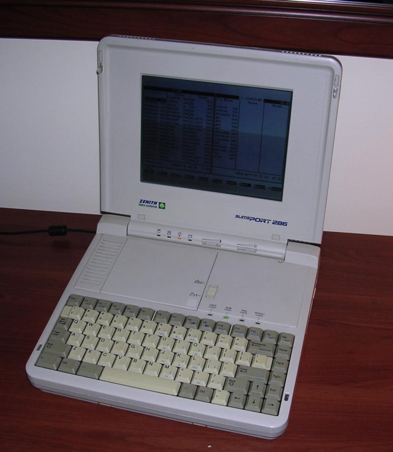 Zenith was a well-known computer brand (in late 1970s they acquired Heath known from theit Heathkit), in 1980s they made simple computers and CP/M machines, in 1985 they made their first portable PC (Z171). This laptop has 286 processor and 2.5" hard disk. It has true monochrome LCD with nice contrast and VGA-compatible graphics. Later Zenith SupersPort was released, which was bigger, but had bigger hard disk and modular battery expansion. Because battery packs in SupersPort could be stacked and expanded, it was used in US Army.