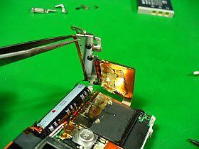 本体の分解は、まずズーム・ボタンの下のフレキを台座から、引き剥がす事から開始。(左写真)
