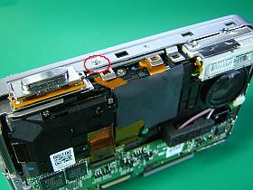 左写真<クリック>で、LCDを外した様子...赤丸印が止め板。