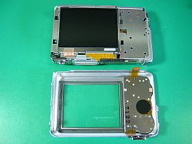 LCDは、上角2箇所で止められていて、止め板を先細ペンチで少し広げてやると、簡単に外せます。