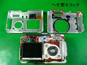 シャッタ釦やロータリ・ダイアルの在る天頂部は、へそ型小フック3個だけで留められていたのですが、無理にこじ開けたために、中央部のへそが取れてしまい、後でちゃんと閉じられなくなりました。(少し隙間が出来ます。とほほ!)