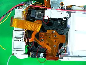 次に、レンズ部後部の“CCD保持部”を覆っている主基板を外しましたが、半田付け箇所が多い上に、厄介な事に6接点のフレキ半田付け端子があります。取り敢えず、それは外しましたが、ここは、後で問題が発生。(後述)