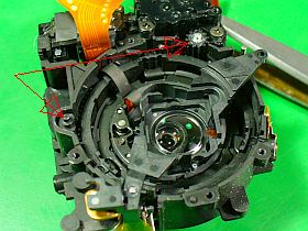 写真左側のギア付きシャフト(?機能判らず)は、うっかりしているとレンズ筒内に抜けて落ちて、後で気が付く厄介物。