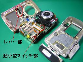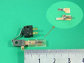 それは、CAMEDIA C-40 ZOOMの電源用リーフ・スイッチの流用です。(幸い、当苑には沢山の死物?があるので、即利用可)