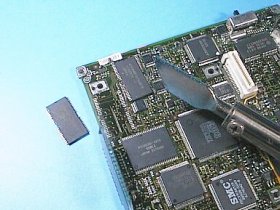 (メモリ)パッケージを細目のピンセットで心持ち持ち上げるようにしながら、足ピンの上に半田鏝の先を当てて軽くスライドさせていると、暫くしたら少し持ち上がって来た。(おっほ、いい感じ!) 片側の全部のピンが完全に離れたら、基板を回して反対側も。これなら、基板にあまり無理をさせないで済みそうだ。