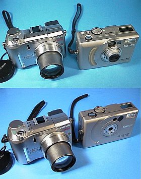 左の上側の写真は、PowerShot A5(1,024x768 pix2 81万画素)で、下側はPowerShot A50(1,280x960 pix2 130万画素)で撮影し、縮小したものだが、やはり解像度が低い方では斜めの稜線でジャギーが目立つ。