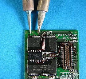 先日の「4月記念追加」で、yさんにお送りした16MB拡張メモリ、"動作がおかしい"との事だったので送り返して頂いて、調べてみた。原因は、足ピン間の細いブリッジ/接触だった。