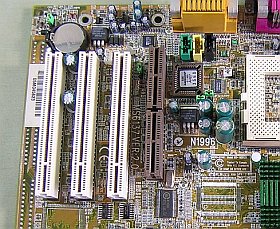 (AGPは無理だが、)PCIスロットには挿せるかな?と思ったが、どうやらこれは専用のスロット(写真の「こげ茶色」)でしか使えないようだ。