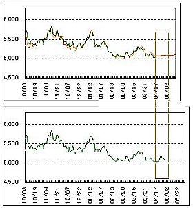 で、予測カーブは至って平穏!(?)・・・ しかし、左図下が、実際の値の変化(緑線)で、この後、上方へ一旦上がるピークが出来ていたのだ。(茶色の四角の範囲)