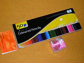 日本橋で、この「色鉛筆50色セット」を見掛けた時、孫娘の教育用に良いのではないかと閃きました。(左写真 \680税込み)