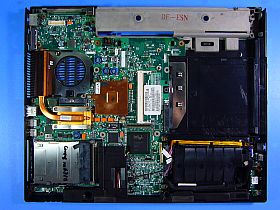 シリアルATA-HDDが載るタイプのHP Compaq nx6310動作ジャンクをネット・オークションで買ったのですが、到着したら、電源が入らない不動品でした。結局、被害折半で決着。(左写真は液晶部を外し、上蓋を剥がした状態 総費用\1,438送料、手数料込み)
