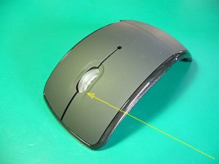 全体のギミック、無線子機の内蔵部掘り込みや折畳みスイッチの方式(左写真<クリック>)などは面白いのですが、よく使う前後送りのためのホイールのスイッチが、前送りの時の“小さな指力”で入ってしまい、ロック状態になってしまうのが拙い!