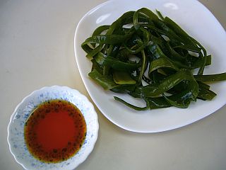 茎わかめ”は丁度良い幅のものがあるので、これをそのまま短く1〜2cm長さに切って、「青ジソ」(か「酢醤油」)で食べてみたら、これがなかなか美味しい!(左写真は、短く切る前の姿)