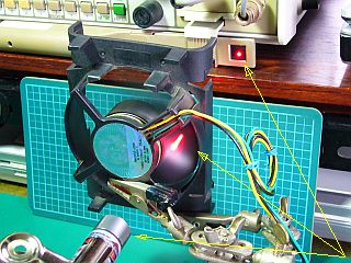 そこで、「光ビーム」を「CPU冷却用ファン」(の羽根)でチョッピングして、“モニタ出力”を疑似交流化(およそ10〜100Hzのパルス波)して、PCの“オーディオ入力”にしたら、“サウンド・レコーダ(ソフト)”などでデータ収集が出来るかも!...そこまでは上手く行った!(左上写真)