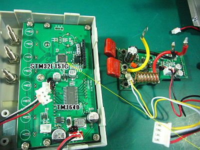 更に分解して、μC(STM32L151C8T)やLED駆動系(TM1640)などの端子が見えるようにして、それらをオシロで調べてみると、これらのデバイスのどの端子にも、動作している"動き"が、全く見えない。