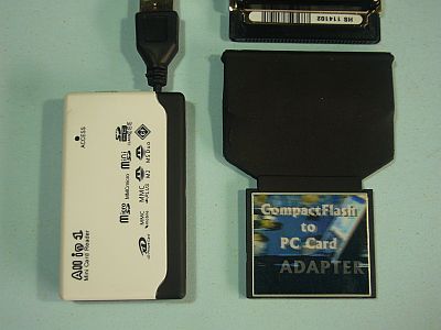 昔の「CF-PCカード変換」(図3右側)を使ってUSB経由で、ファイルを書き込もうとしたが、HDD自体が認識されず。