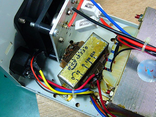 (私の処置として、)物置小屋から、昔、アマチュア無線をやっていた頃に使っていた旧い電源トランスを探し出して来て、それを使って、AC電圧をステップアップしてみた。(図3)