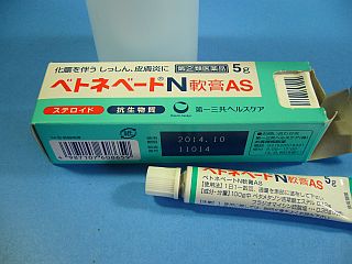 本宅に戻ってから、(勝手に)責任・制約を解除して、この(自分の)皮膚炎を治す事にし、「美肌水」を作ったり、市販の「ステロイド軟膏:ベトネベードN軟膏効果タイプ」(\1,050税込み)を買って来て、トライしてみました。