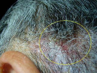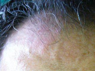 額の方は、無事に治ったようですが、実は左耳の上の湿疹/皮膚炎が曲者でした。(左写真)