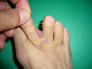 これは、自分では気が付かず、家人から「靴下が汚れている!」との指摘で気が付いたのですが、右足の指の間にも湿疹があったようです。(左写真<クリック>)