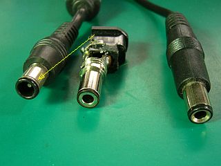 これまでは、15V用が足りなくなると、「中ピン付きの15Vアダプタ」に(変換用)補助プラグを差して使っていました(左写真)が、プラグ+が長過ぎて使い難い時があります。