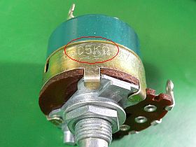 探し回って、やっとC型5KΩ(\100税込)を見付け、試してみたのですが、値不足のためか電圧範囲の狭さや動作の不安定さがあって、満足出来ませぬ。また、B型を使った“擬似C型”も上手く行かず。(更に、C型探しの旅は続く...か?)