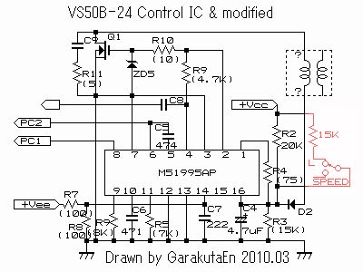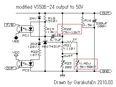 (やりたくなかったのだけど、C型VRの10KΩ以上が手に入らないので、)試してみたのは、VR(=V.ADJ)の効きを良くするため、R20の値を半分(7KΩ)位にまで下げた事。
