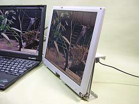 先に試作したXGAモニタ、土台が気に食わなくて、暫く考え込んでいたのですが、ふと思い付いて、ヒンジ部アームの取付け場所を変えてみました。