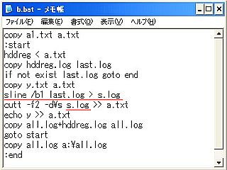 使い方は、「last.log」の後ろから1行目(b1)だけを抜き出して、それをメッセージとして吐き出させる。(尚、/b1は最後尾の行から1番目の意味で、先頭行だったら/f1、数値は行番号で1〜99まで。“/”は“-”でもよい)