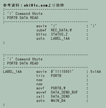 左リストは、添付されていたPIC16C715用アセンブリ・プログラムの一部で、“ポートB群の状態”を読み出し、RS232C出力へ渡すルーチンのようだ。