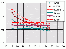 上のグラフは実測の結果で、左は旧型ThinkPadと異物1台のデータ。右は比較的最近(?)の機種で定格19V機のデータ。(HDDのアクセスがあると、これらの2〜3倍の電流になります。バッテリ充電中だと、更に増えます。ディスプレイの輝度を絞ると多少電流は減りますが、測定時は輝度最大で固定)