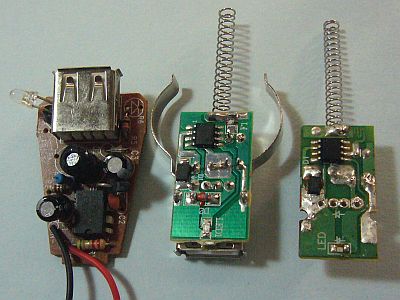 そのコンバータとして、百均品の“車/シガーライタ用USB電源”を分解したものを利用したが、一番最近に入手した最新版(図5の“右端”)を使った。