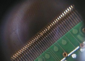その内、ふとCPUに眼をやると、足ピン列に何やらムラが見えます。ルーペで確かめると、ピンがあちこちで曲がっているのが分かりました。半田付けが外れているピンもあります。どうやら、原因は、これらのようです。