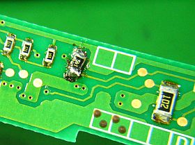 そこで、インバータ基板をじっくり眺め回したら、電流制限_検出_用抵抗1.1KΩがあったので、これをCF-W2基板から剥がした560Ωに入れ替えました。_左写真_